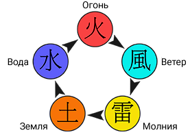 В бою стихии могут взаимодействовать друг с другом. На картинке показано взаимодействие между основными стихиями. Так, к примеру, огонь сильнее воздуха (техника огня будет усилена, а техника воздуха остановлена), а воздух сильнее молнии и так далее. Однако, подобное усиление не будет действовать в отношении более высокой по уровню техники воздуха со стороны меньшей по уровню техники огня. Таким же образом можно комбинировать стихии в бою, тем самым усиливая свои техники (выполнив сперва технику стихии огня, следующим ходом вы можете ее усилить, сделав технику стихии воздуха).